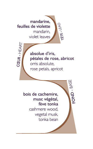 Iris Cachemire, combina notas florales de mandarina, violeta, iris y rosa con toques frutales. La base de cachemira, almizcles y haba tonka aporta elegancia.