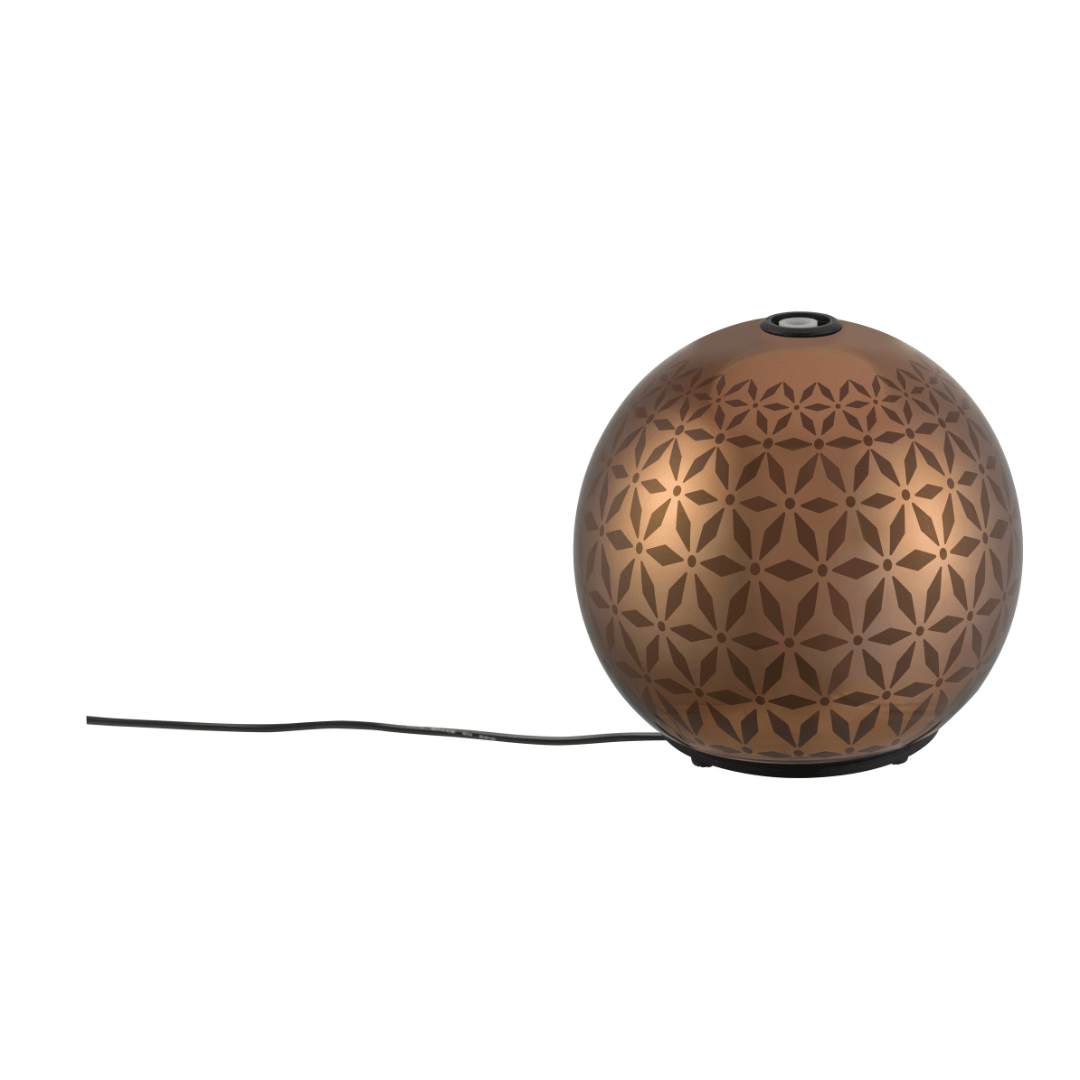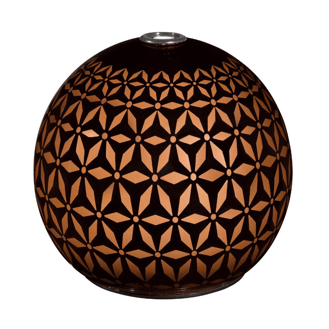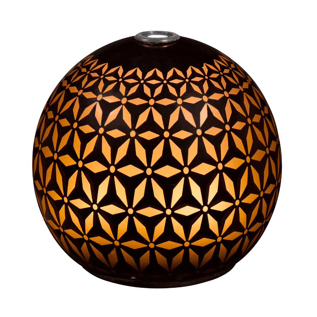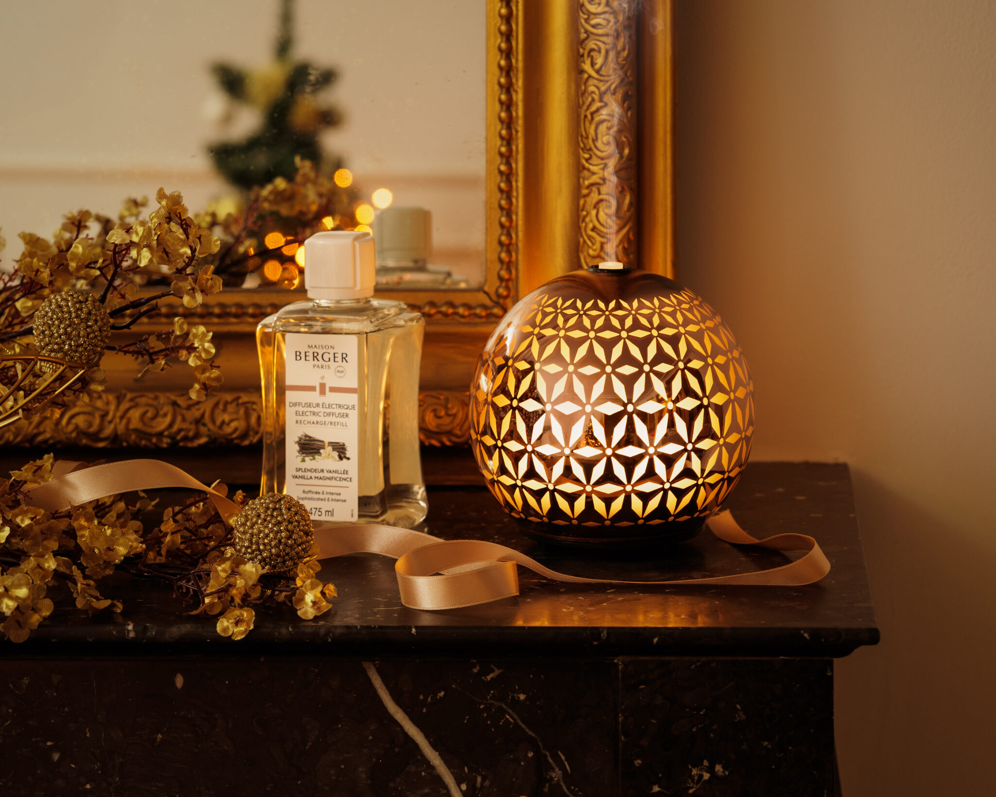 El difusor de perfume Pomelis de Maison Berger, con su forma esférica en color chocolate y un interior metálico, deja pasar una luz suave y cálida a través de las estrellas, creando una atmósfera acogedora. Capacidad del depósito máx. 80 ml.