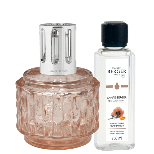 Se presenta en un cofre que incluye: 1 tapón normal, 1 tapón difusor, 1 mecha, 1 pequeño embudo y 1 recarga para lámparas catalíticas con aroma Velours d’Orient 250 ml.