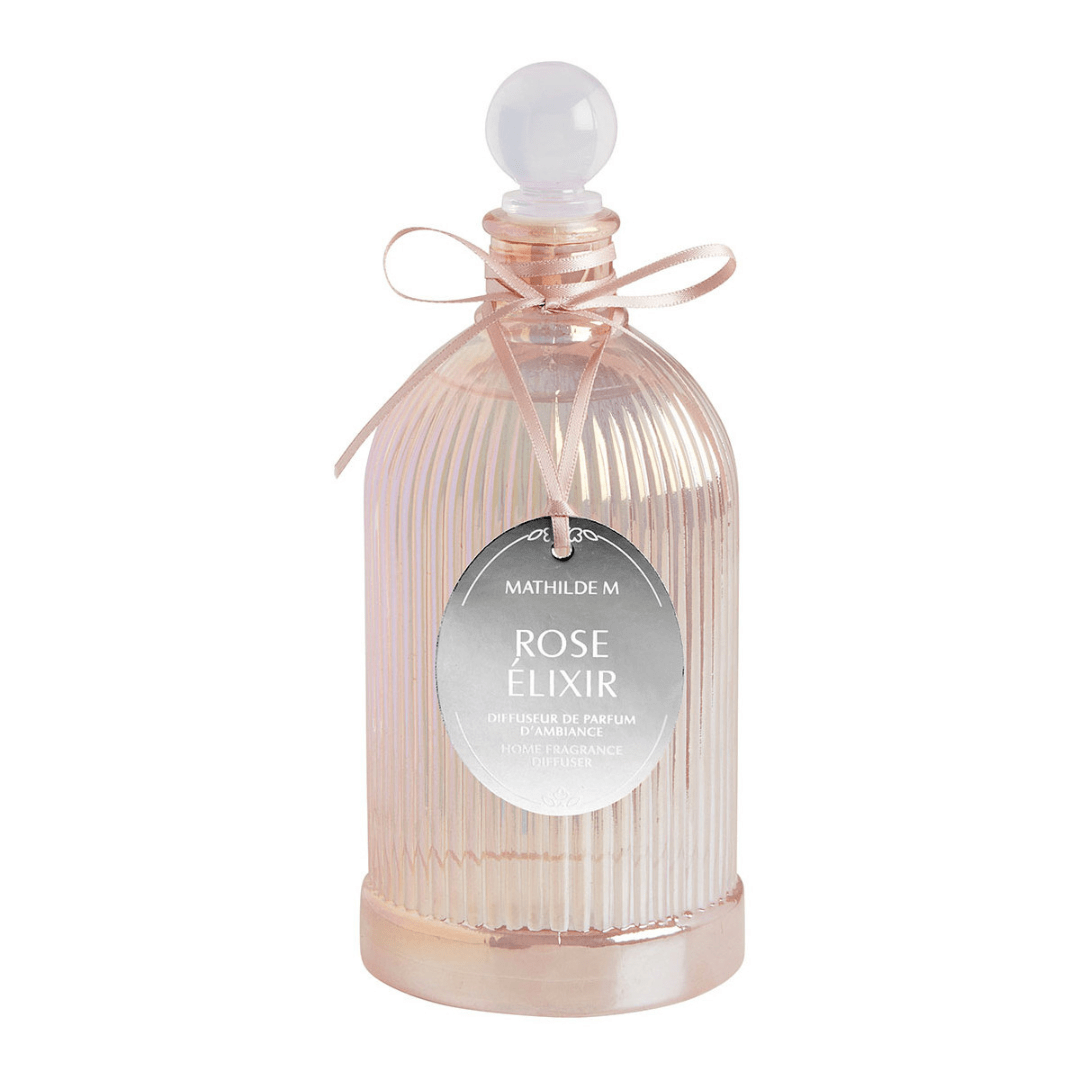 El mikado para hogar Rose Élixir – 500ml de Mathilde M, de colección limitada en un rosa nacarado y brillante, crea una atmósfera agradable y acogedora por su aroma embriagador, de notas empolvadas por las rosas y las violetas junto los almizcles blancos.