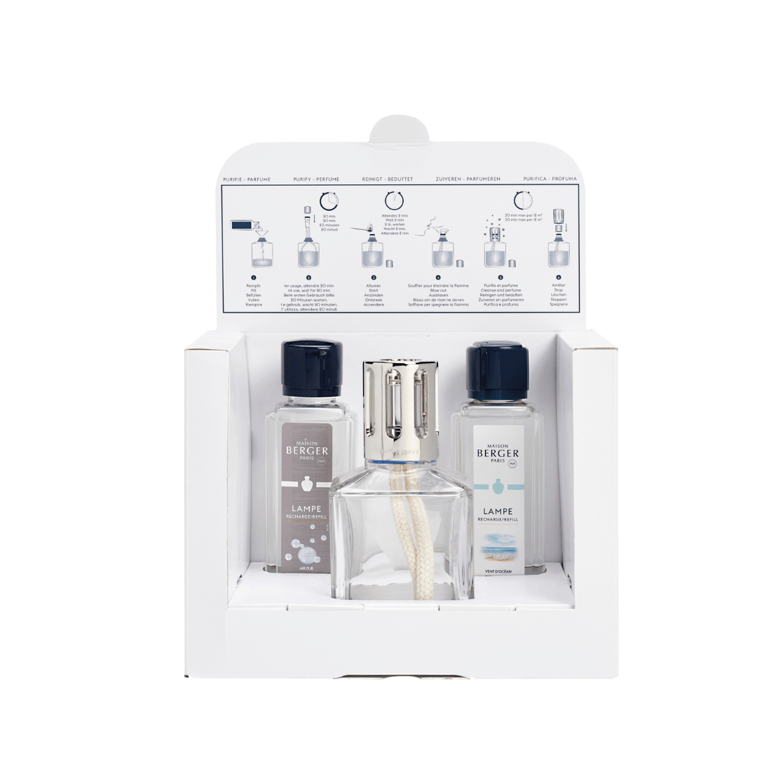Se presenta en un cofre que incluye: 1 tapón normal, 1 tapón difusor, 1 mecha, 1 pequeño embudo, 1 recarga para lámparas catalíticas aroma Vent d’Océan y 1 recarga para lámparas catalíticas Air Pur (sin aroma) 250 ml.