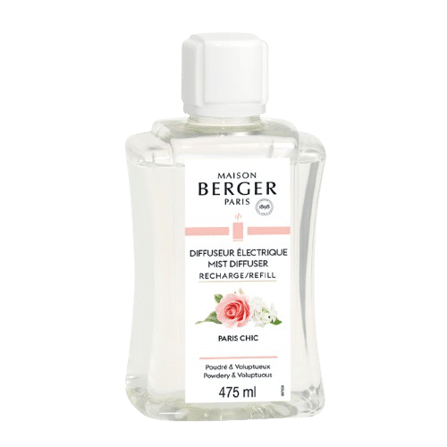Bruma para difusor de perfume Paris Chic de Maison Berger. Fragancia floral que mezcla, el olor de la bergamota, el iris, la rosa, la violeta, los almizcles y el ámbar. Ideal para crear un ambiente tranquilo y relajado.